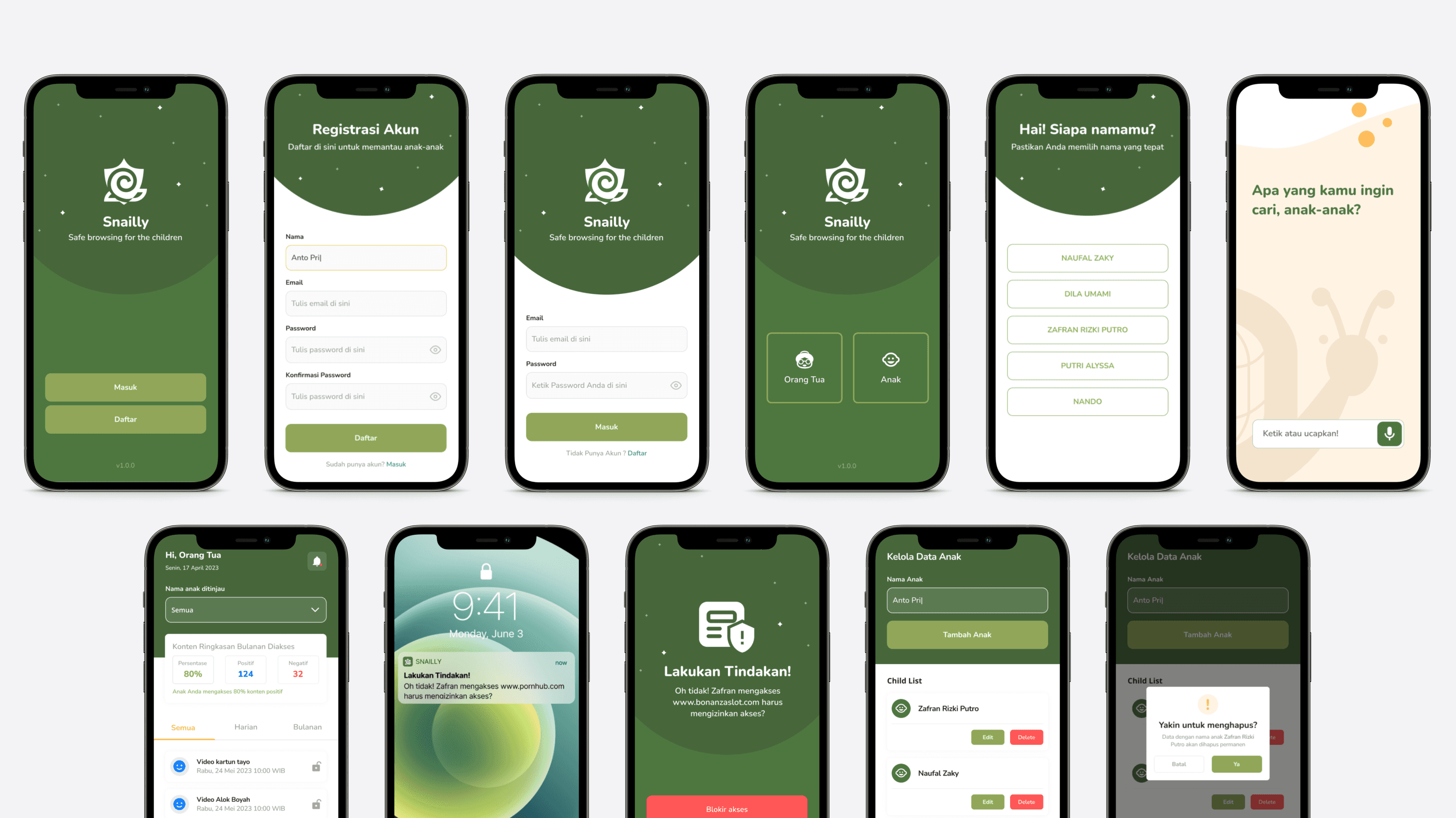 Snailly is a dual-function platform consisting of a mobile app and a web-based monitoring dashboard for parents. The app, installed on the child’s device, uses machine learning and deep learning algorithms to dynamically analyze and filter out inappropriate words and images on websites in real time. This filtering mechanism works even as children browse, identifying harmful or age-inappropriate content based on contextual keyword analysis and image recognition.
